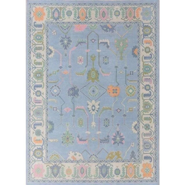 Turkish Oushak Hand-Knotted Wool Rug – Light Blue with Pastel Pink, Green & Ivory Accents – Traditional Floral Design, 8x10 ft